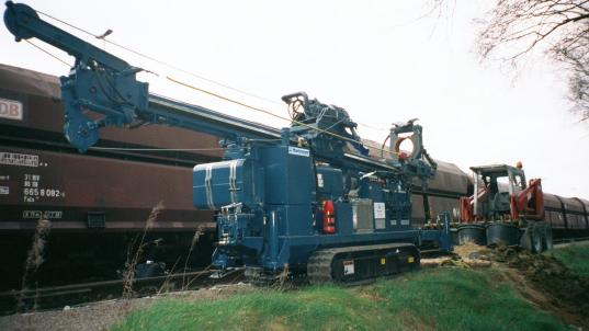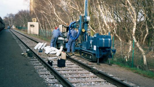 Bohrarbeiten neben einer Gleisanlage auf einer Berme